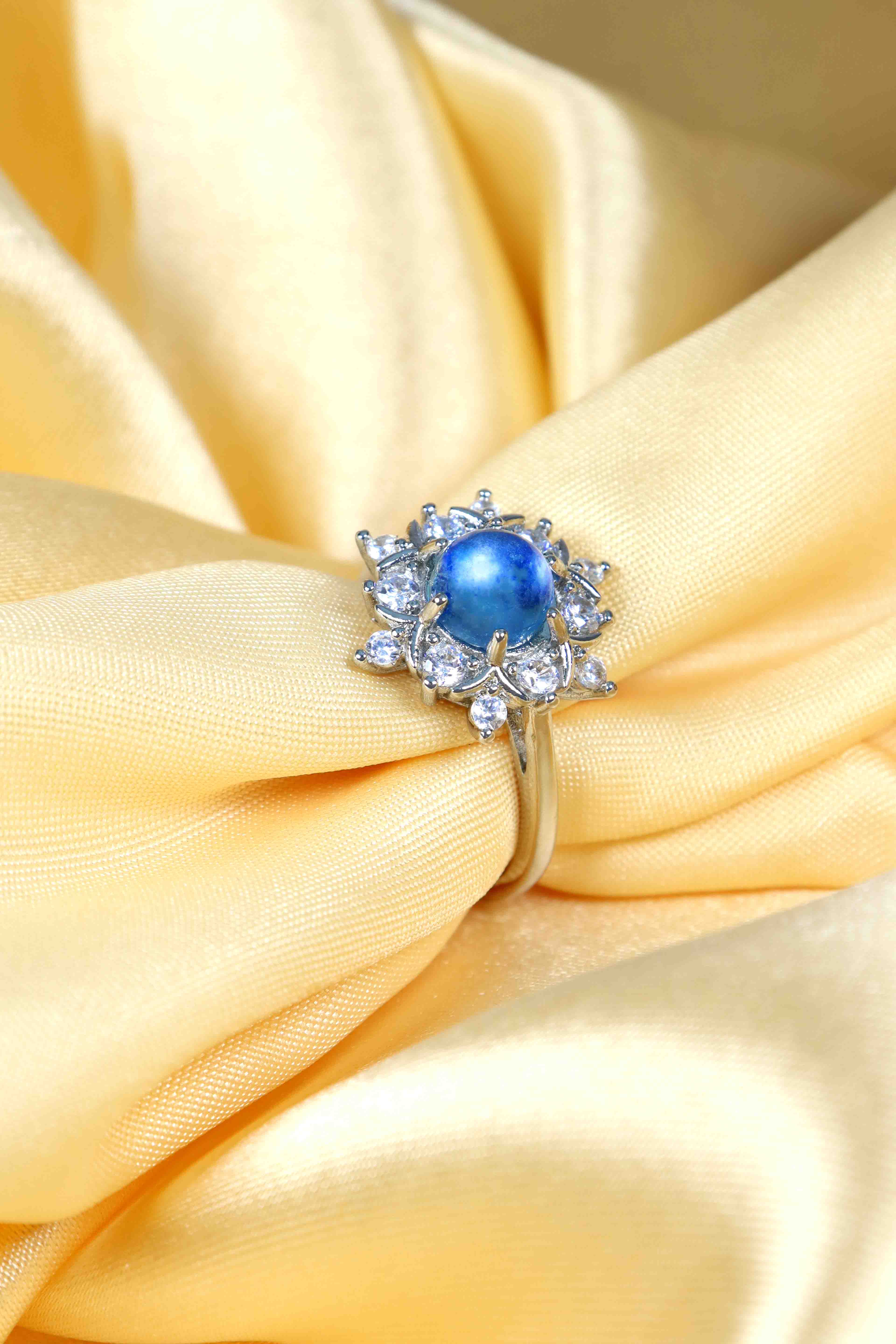 -Elegant UNIHLC Celestial Blue Moonstone Halo Ring with a deep blue moonstone center.