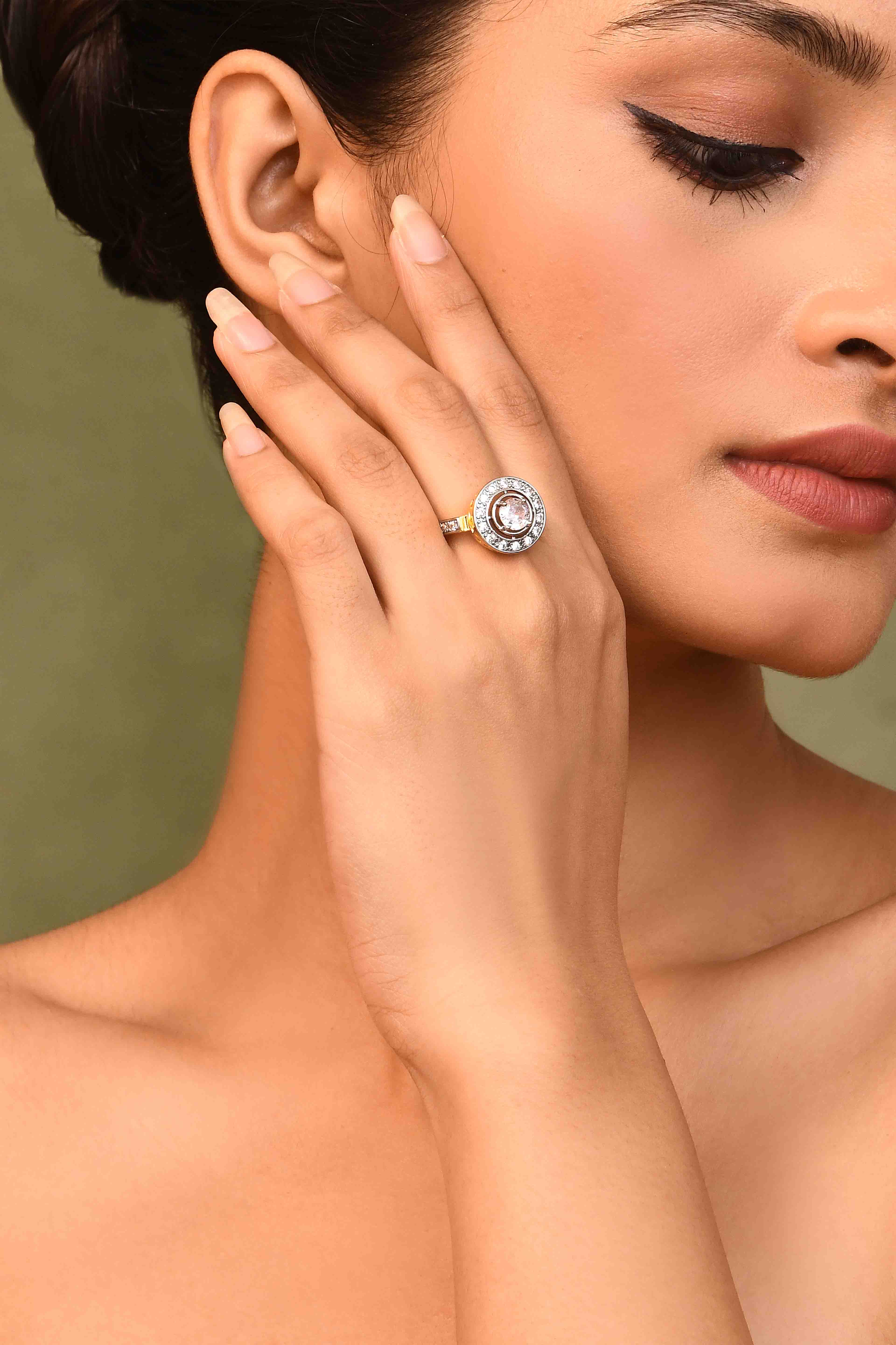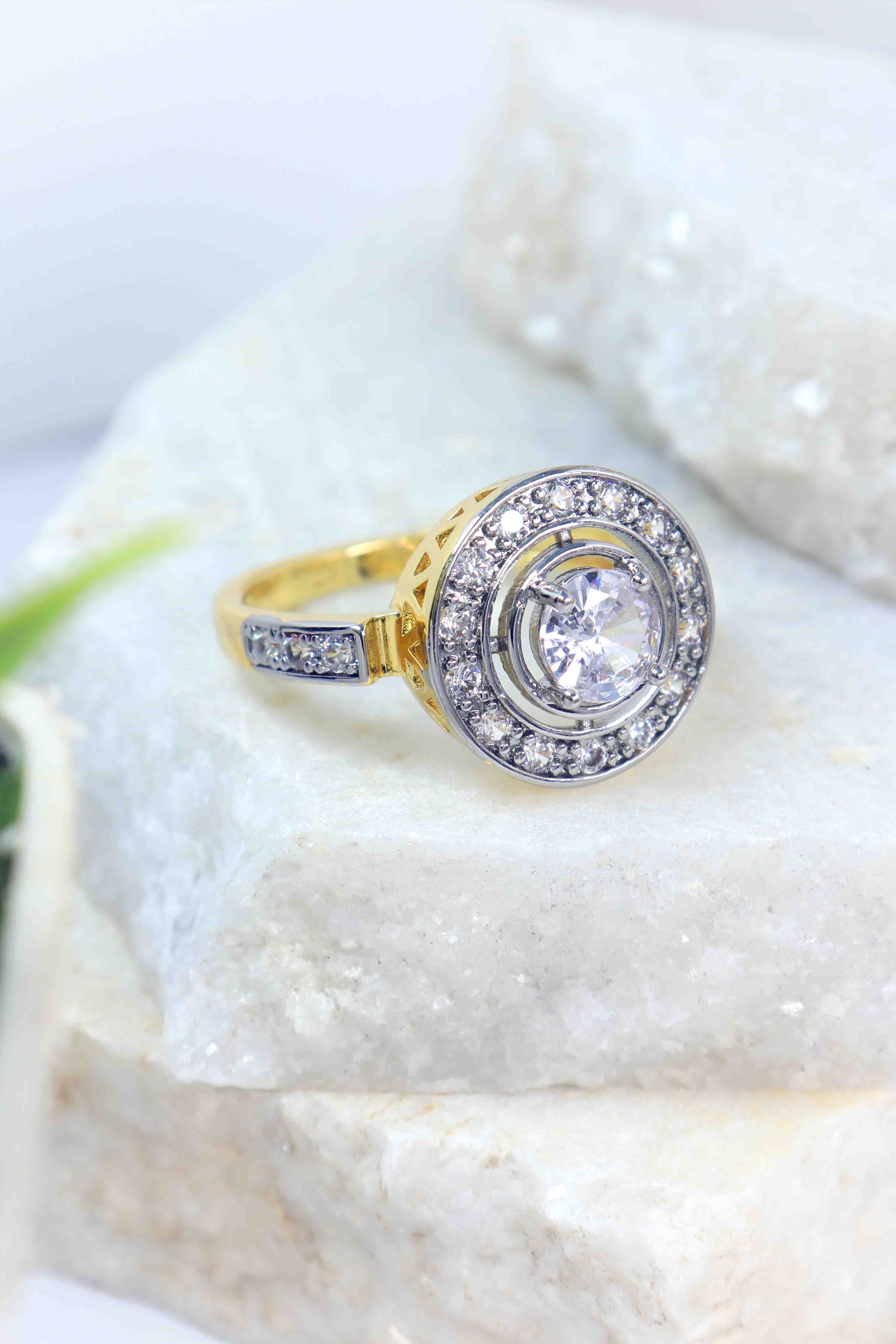 -A dazzling center stone and double halo of CZ crystals.
