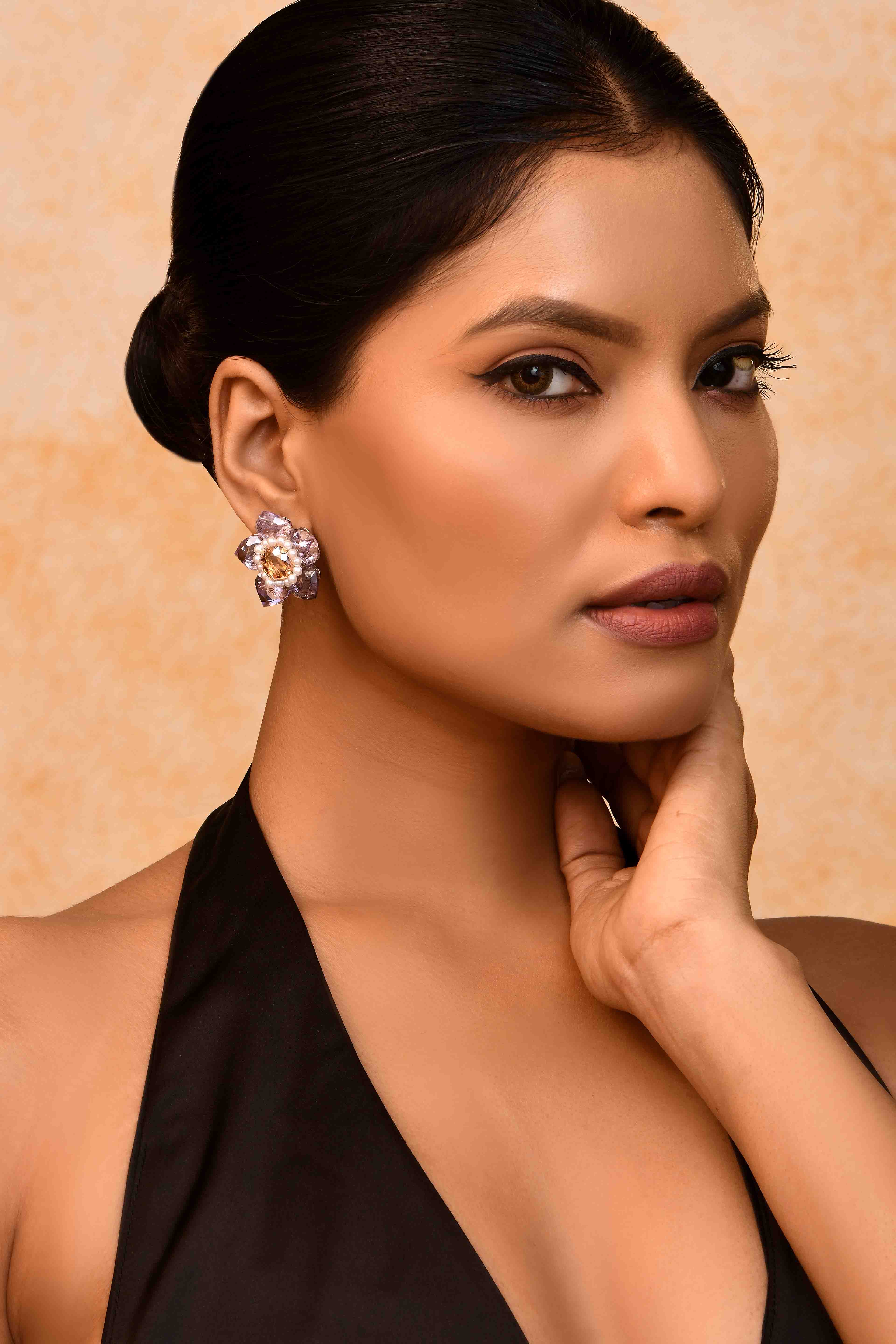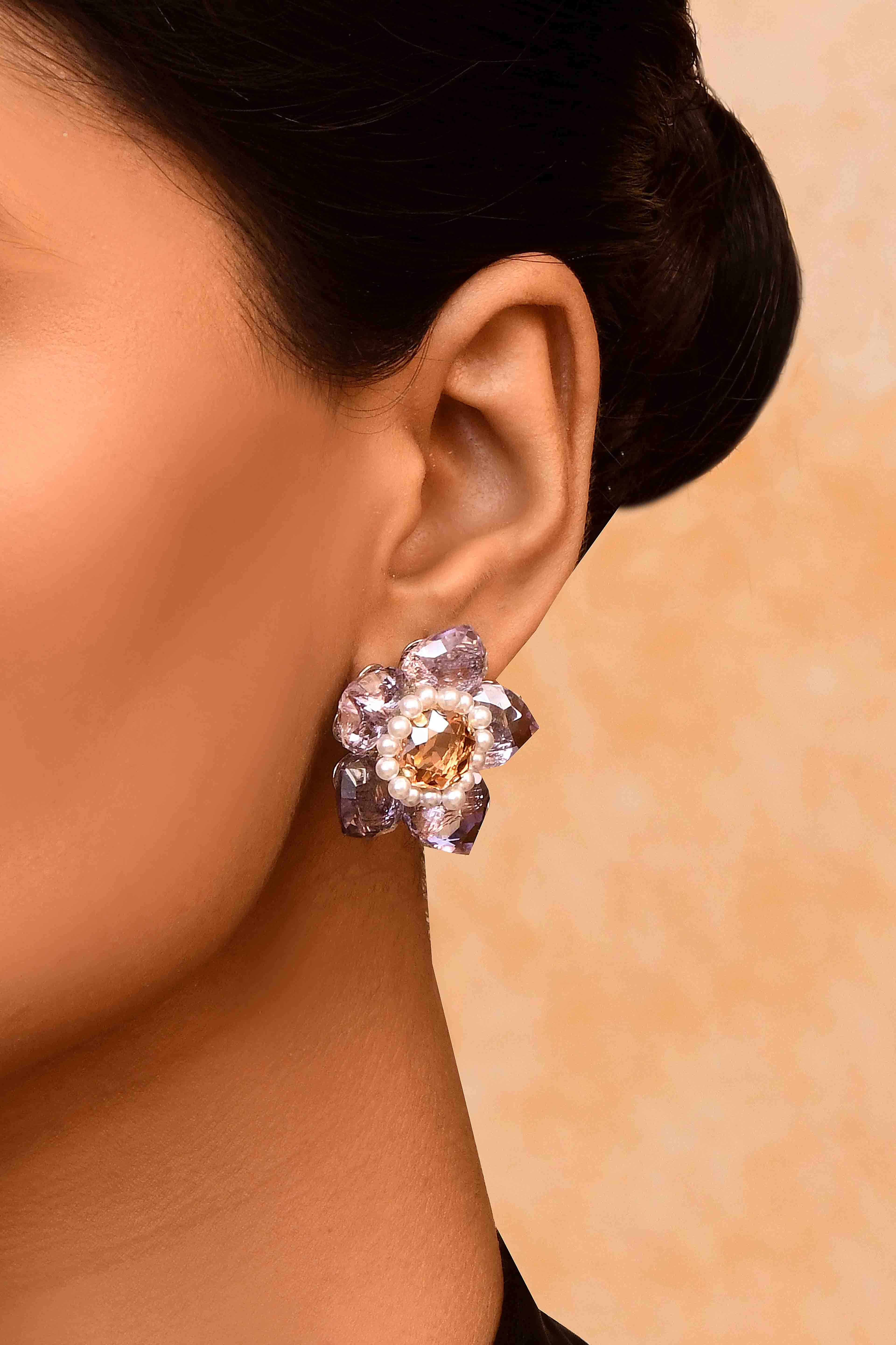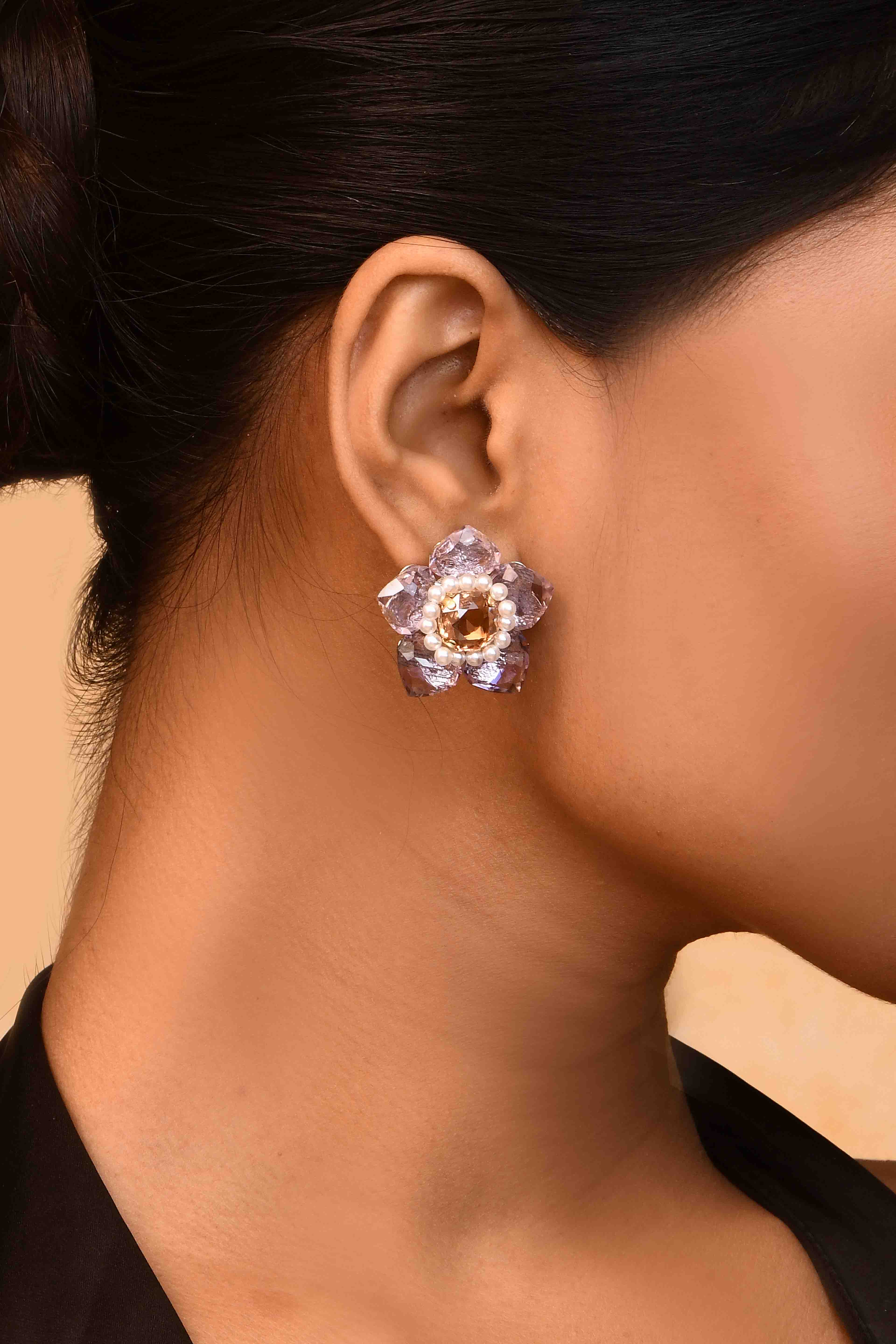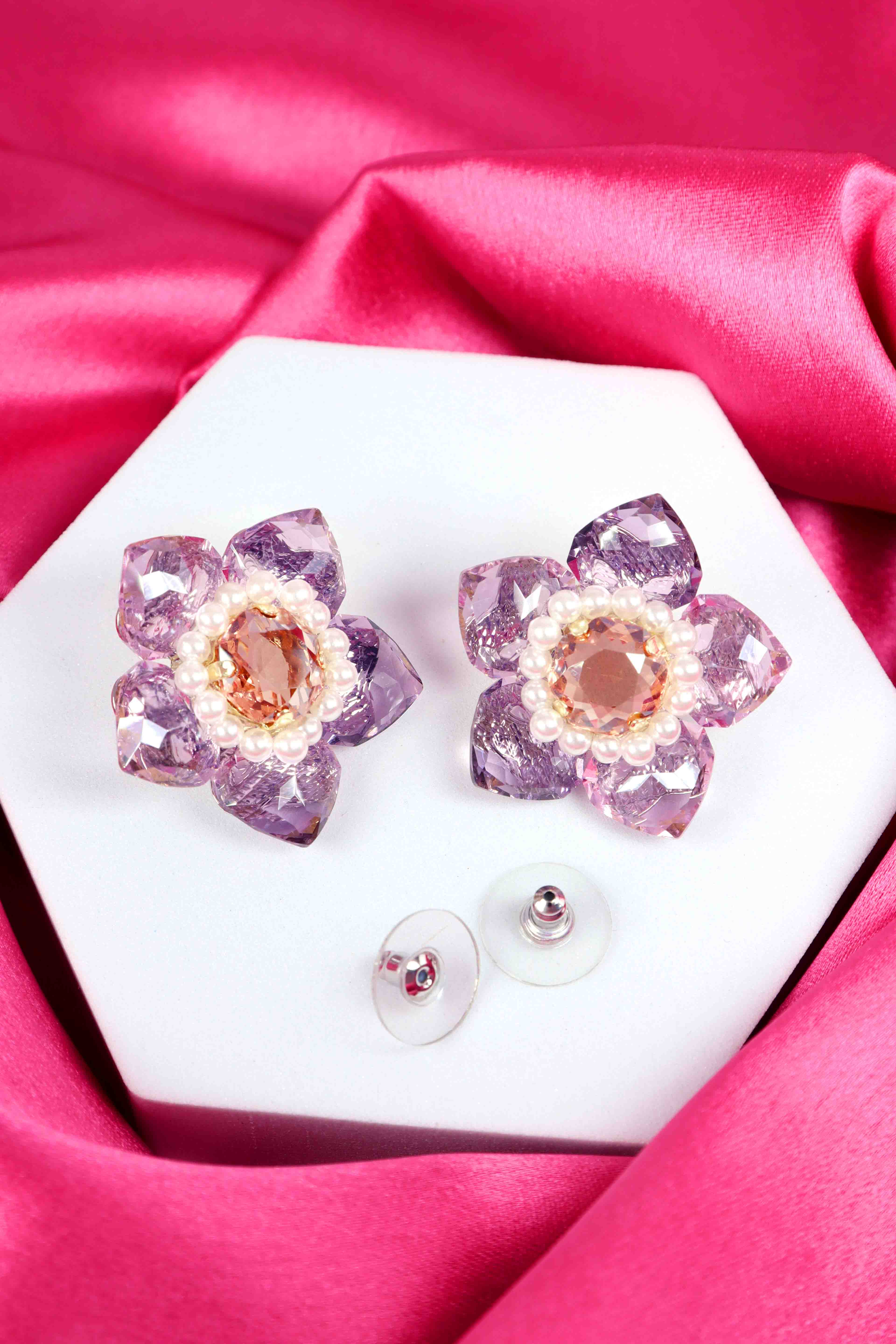 -Floral earrings with lilac crystal petals and pink center