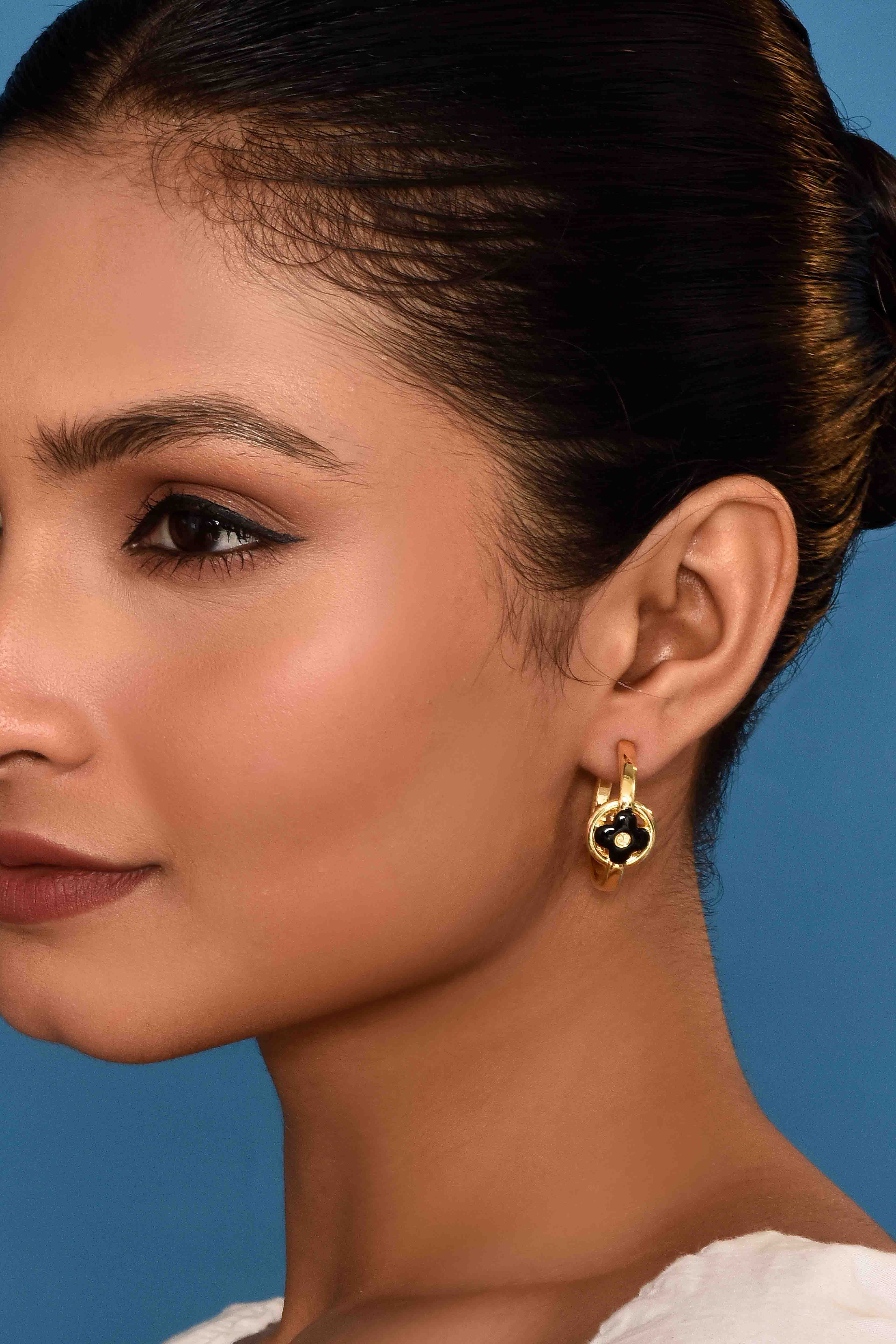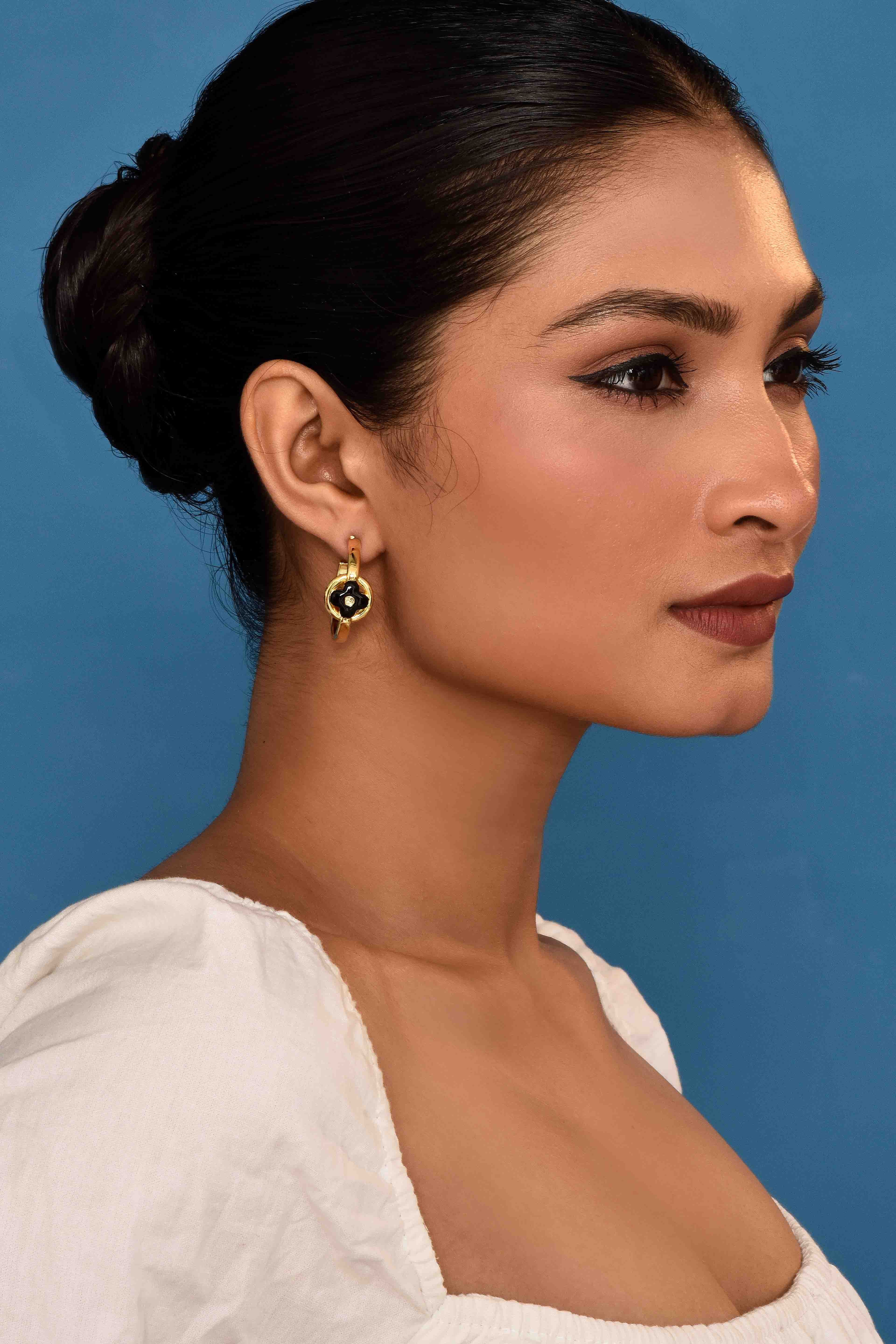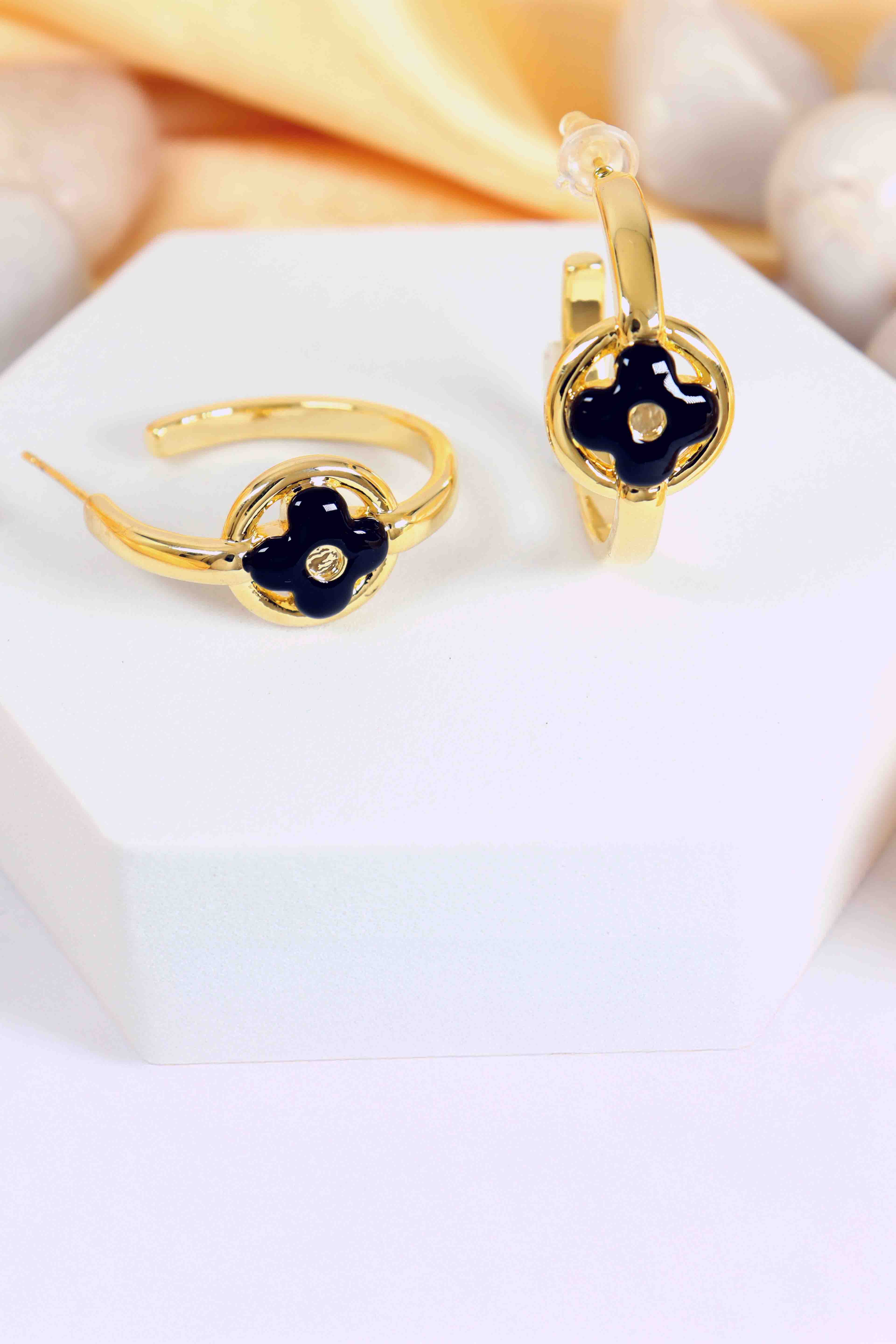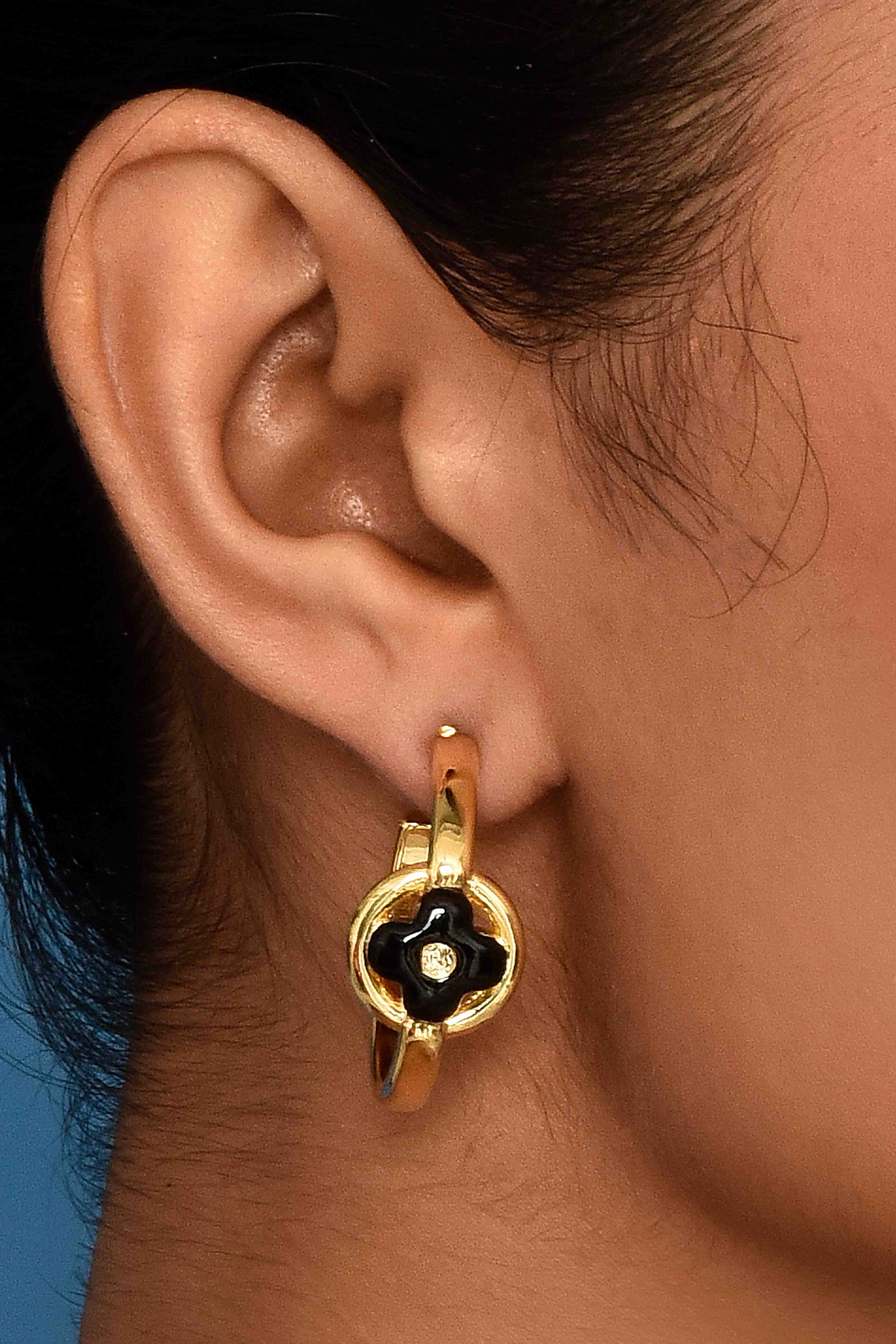 -Sleek gold-tone mini hoops with a chic black enamel centerpiece
