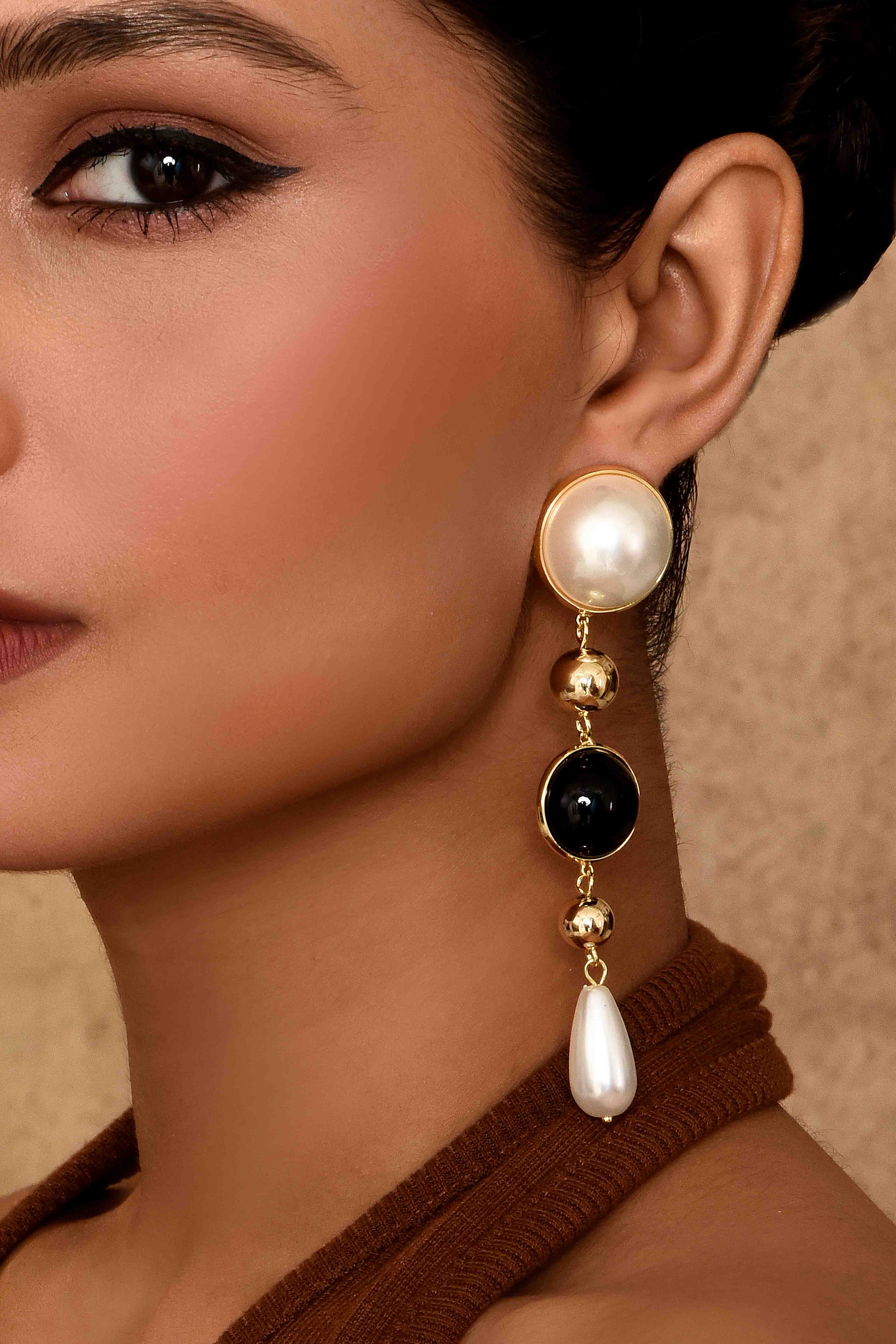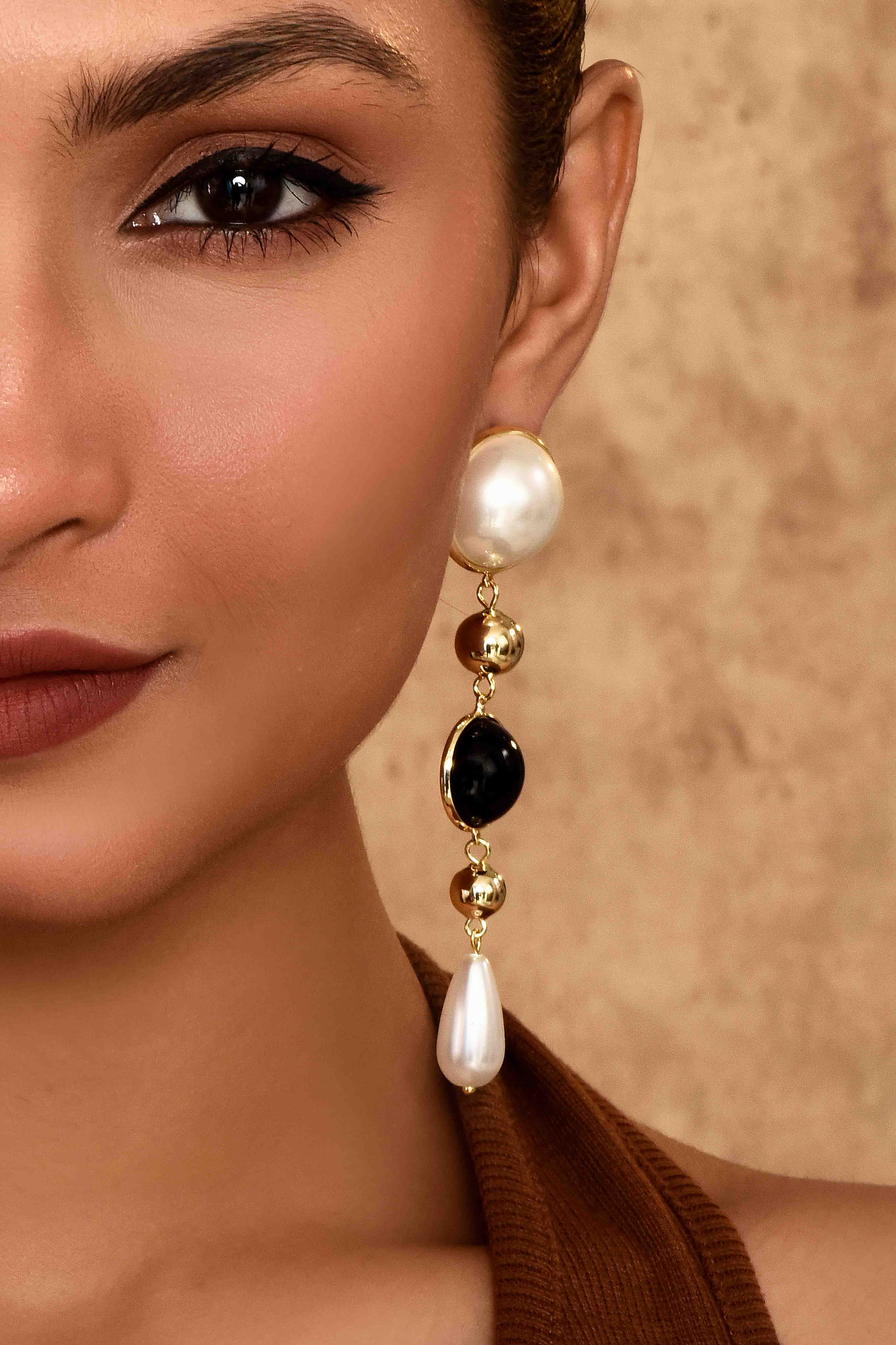 -Features a mix of pearl, black stone, and gold-plated beads