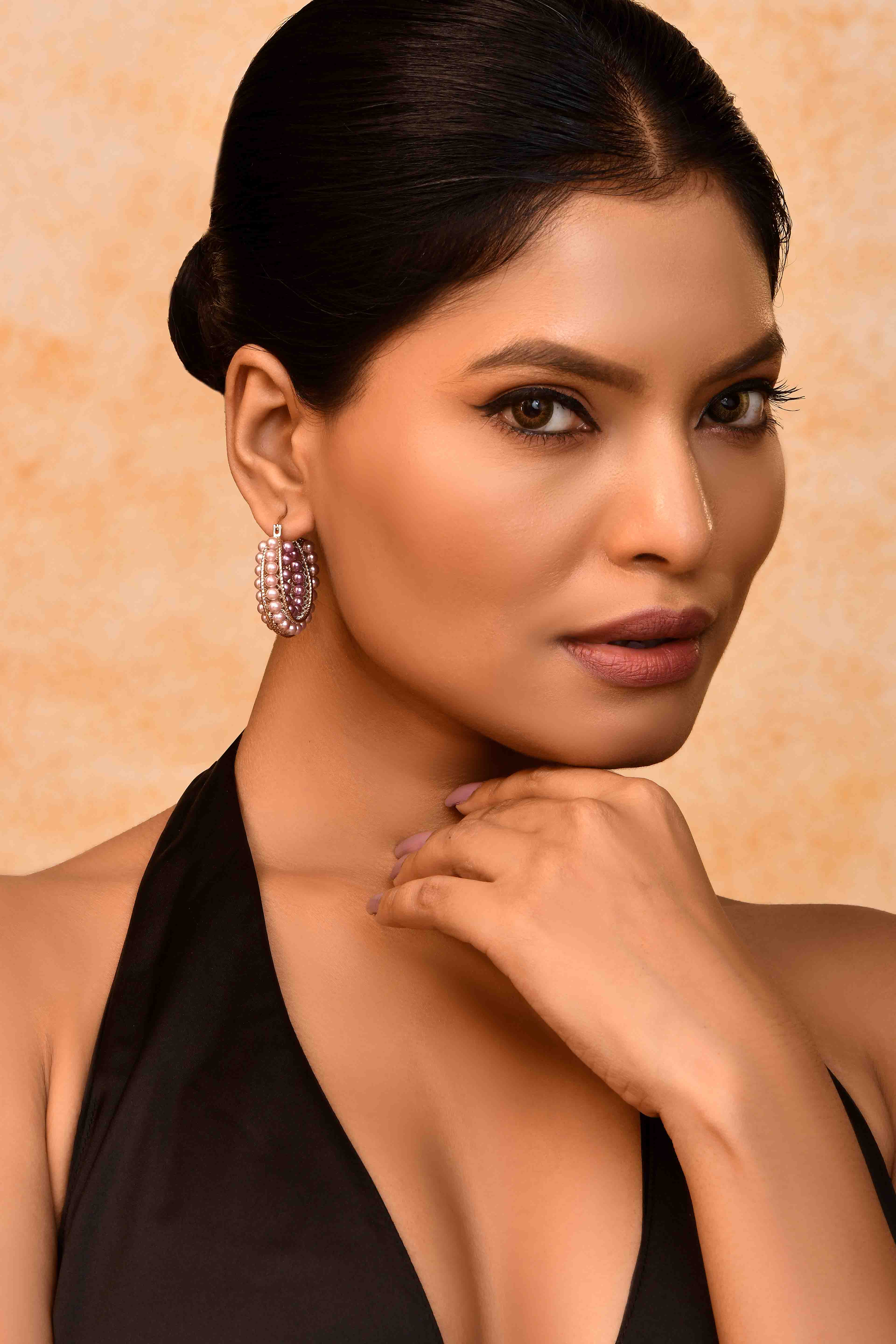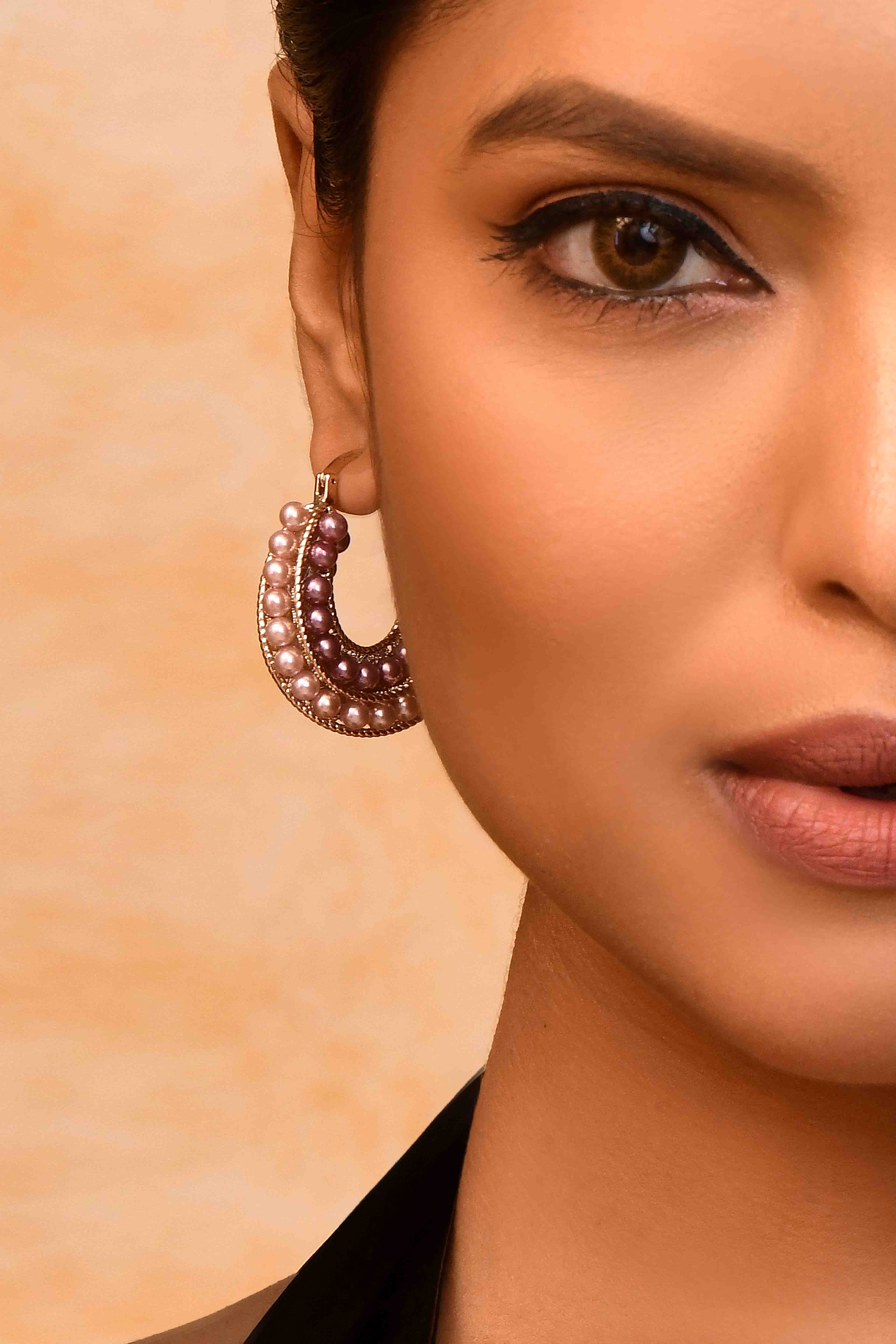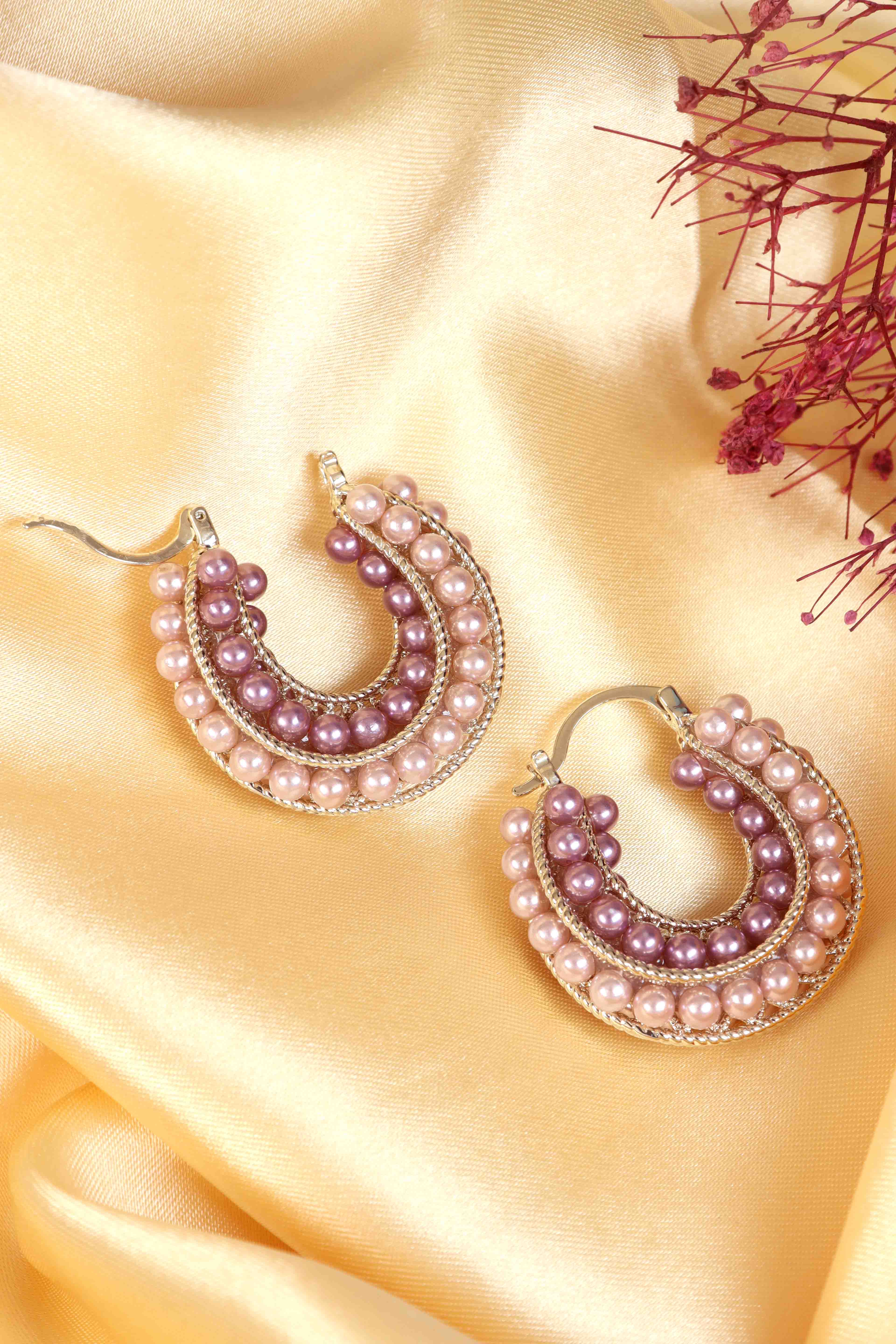 -Gold-tone hoop base with layered beaded detailing