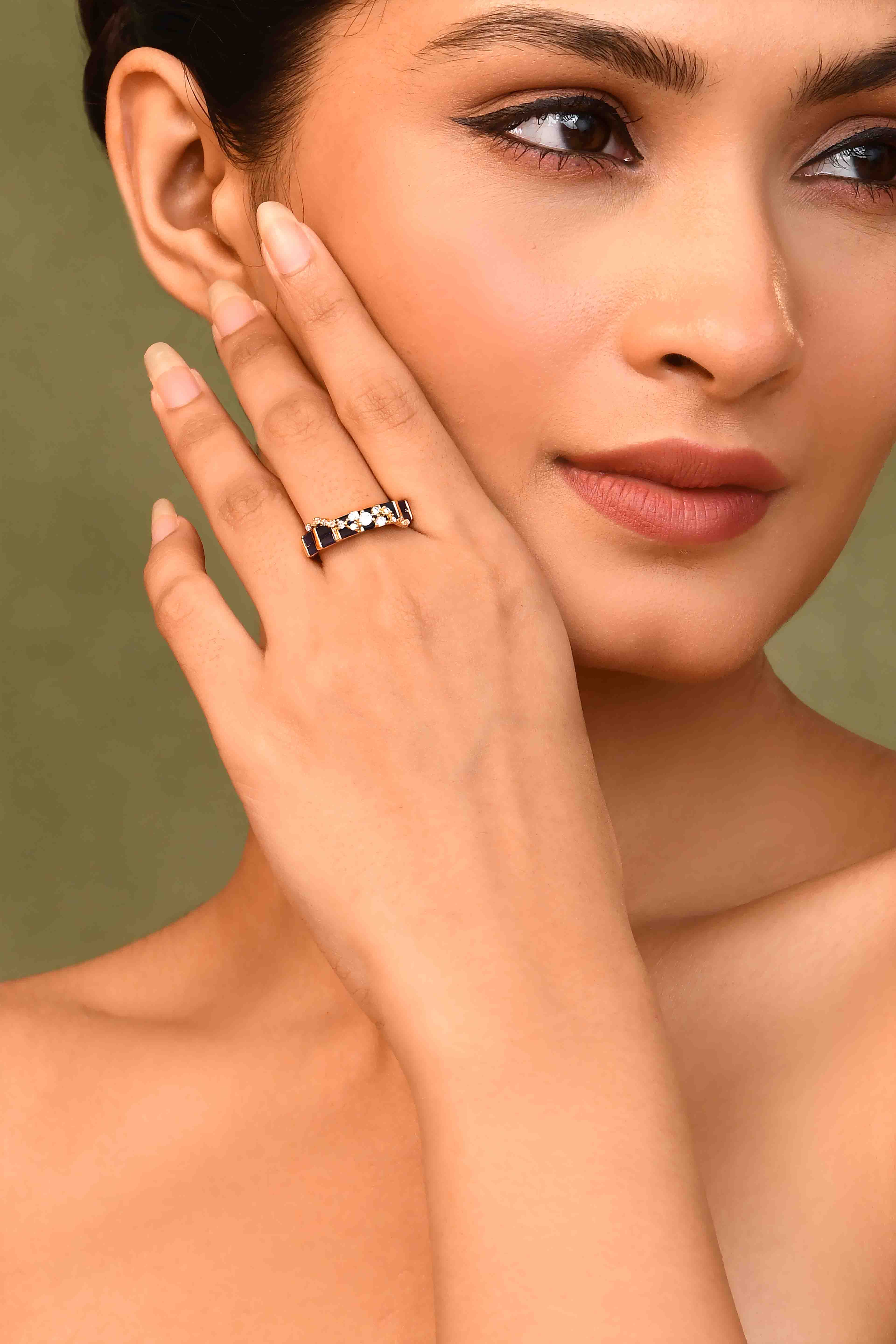-A brilliant sapphire-colored band accented with cubic zirconia stones.